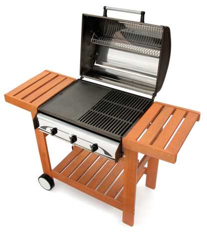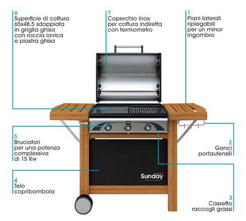 Grill a gas cottura combinata lava + piastra 65×48,5 cm, 3 bruciatori in ghisa con accensione piezoelettrica, con coperchio forno in acciaio inox, termometro, grill lava e bistecchiera in ghisa, con cassetto di recupero grassi di cottura, carrello in robusto legno esotico con doppio pianetto laterale pieghevole, piano reggibombola e ruote.